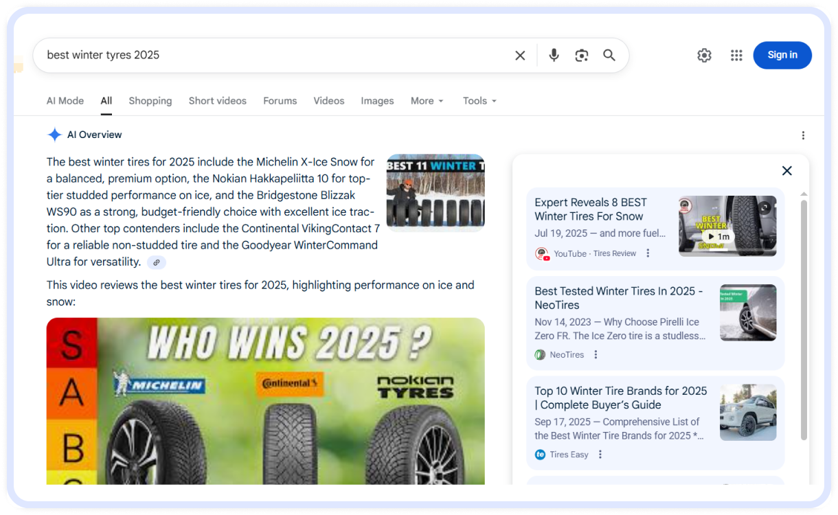 1. We entered that query into the Google search bar. The first thing we saw was an AI Overview providing a summary of the top tires available on the market. That summary was based on the resources Google considered authoritative, along with links to those resources.