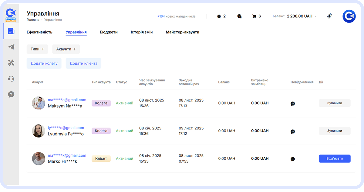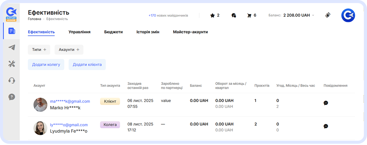 Підключивши Майстер-акаунт, ви отримуєте повний набір інструментів для управління роботою команди та клієнтів. Зокрема, ви можете: