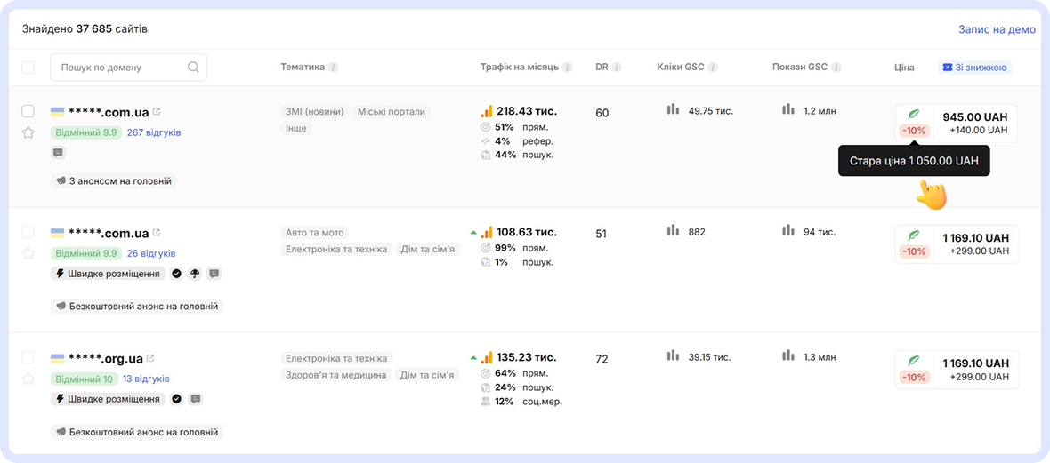 З підключенням функціоналу в Каталогу майданчиків з'являються додаткові знижки на розміщення, які видно Майстру і всім підключеним під нього Колегам і Клієнтам. Знижки активуються та керуються власниками майданчиків. Власник вибирає розмір знижки, може увімкнути/вимкнути її у будь-який момент. Можна провести угоду зі знижкою, доки її видно — оформити завдання, де буде закріплено ціну зі знижкою.