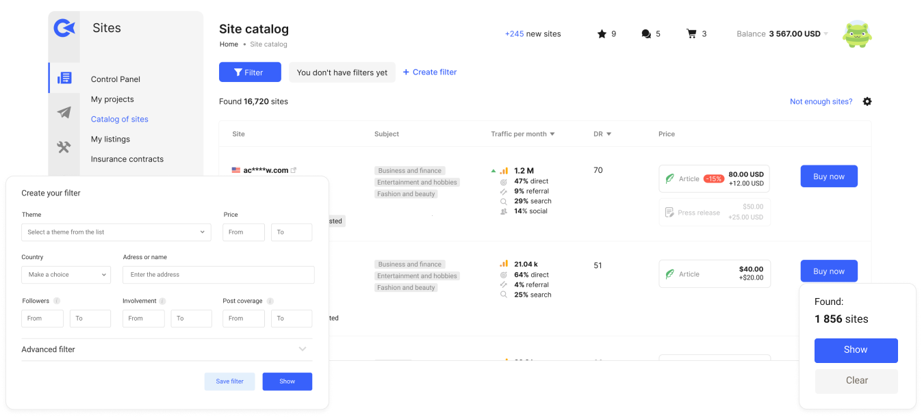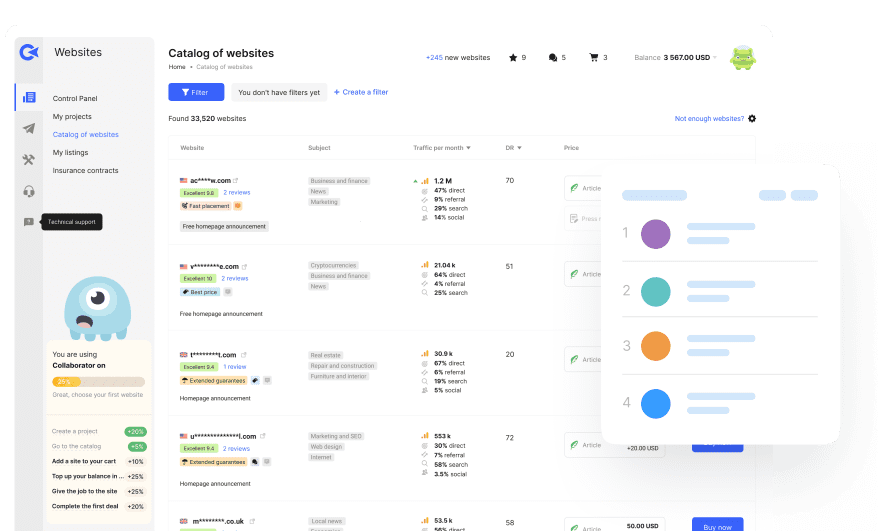 Collaborator’s catalog continues to expand with top websites in a range of categories and countries, offering countless link building opportunities. You can easily find the best option for your marketing and SEO needs by using our 40+ filter options.