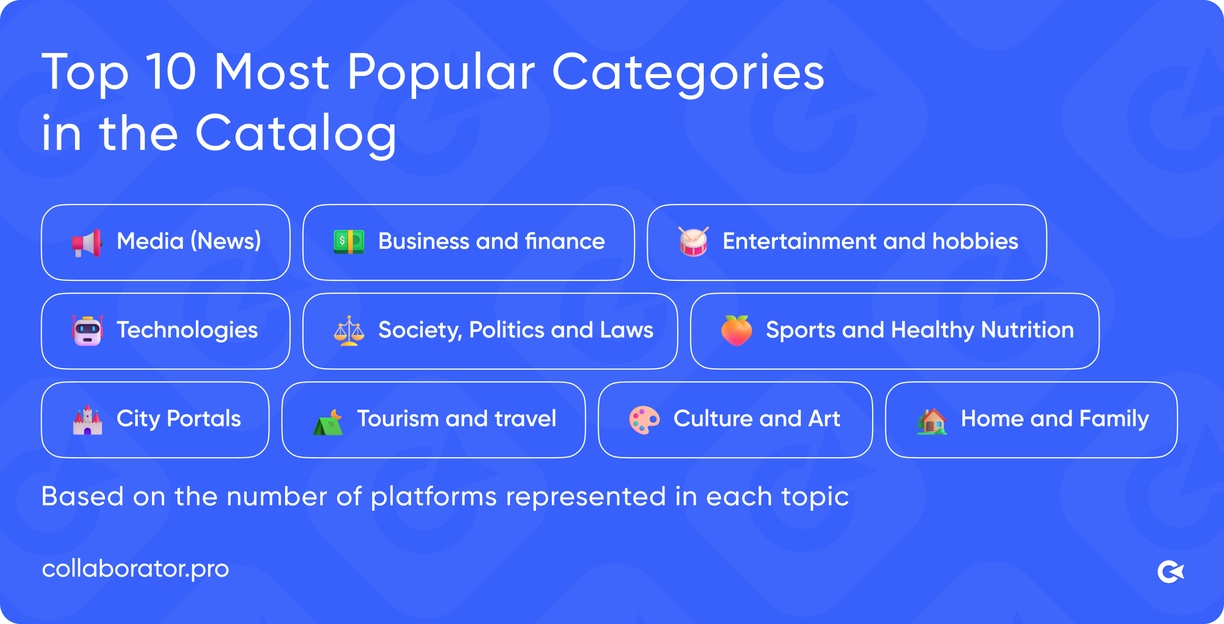 Top 10 most popular platform categories on Collaborator, including Media, Business and Finance, Entertainment, Technologies, Society, Sports, City Portals, Tourism, Culture, and Home and Family.